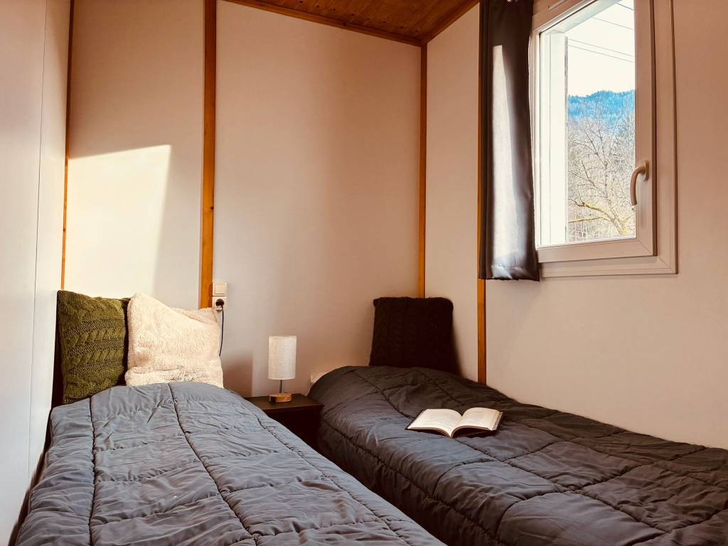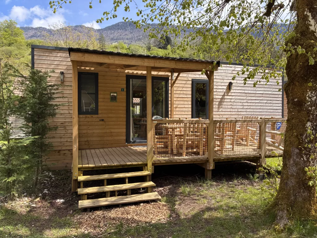 Mobil home bois récent et confortable, équipé pour 6 personnes avec terrasse semi-couverte, son mobilier extérieur Canadien et sa vue sur les Montagnes du Jura