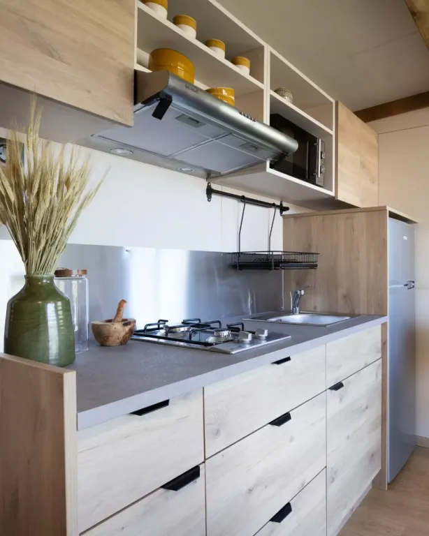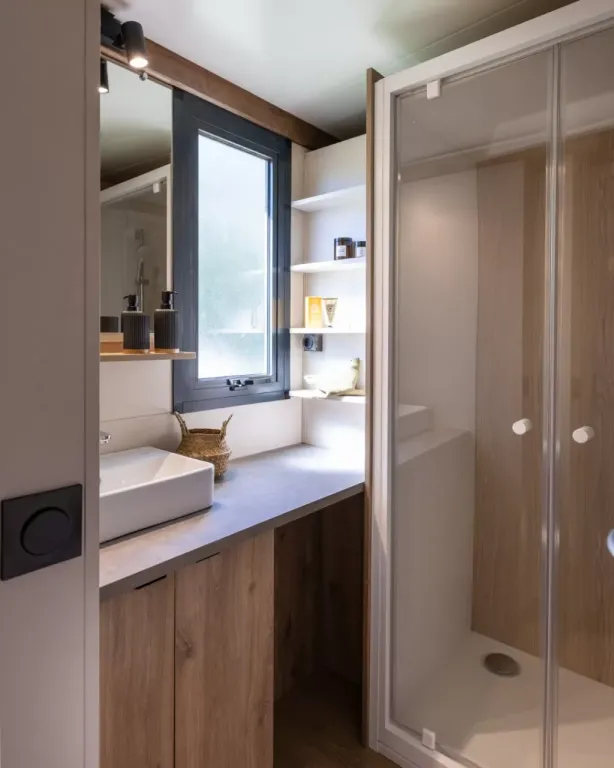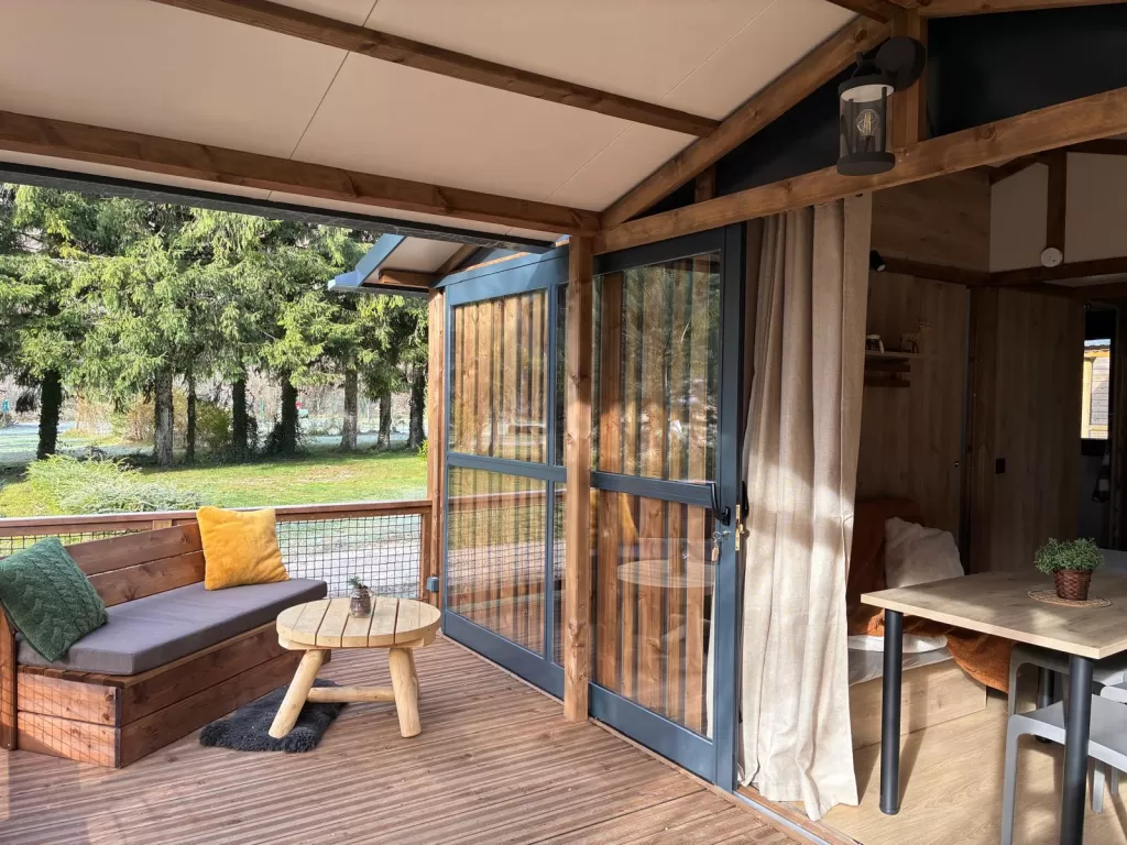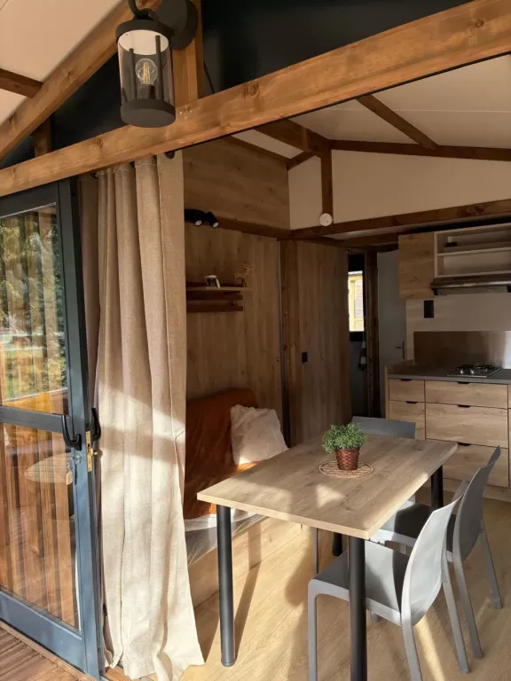 Eco-Lodge Confort : un hébergement chaleureux, lumineux et parfaitement pensé pour les familles jusqu'à 5 personnes.