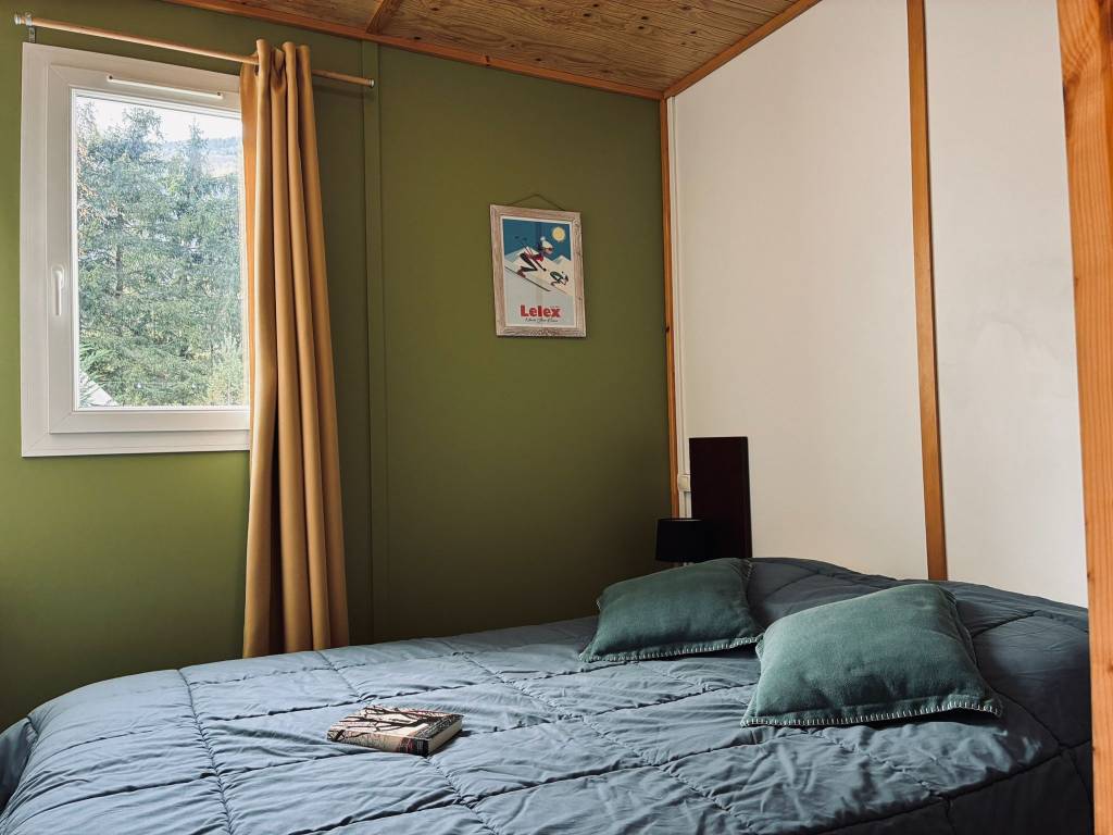 Mobil home bois dernière génération, lumineux et confortable, équipé pour 6 personnes avec terrasse semi-couverte, son mobilier extérieur Canadien et sa vue sur les Montagnes du Jura